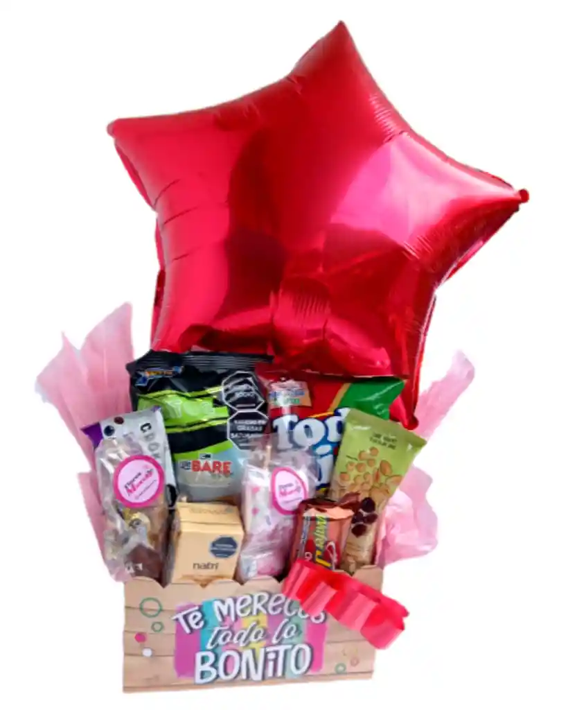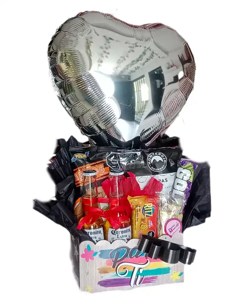 hermosa ancheta con comestibles deliciosos y bebida de jugo , una opcion tiernas y cariñosa de sorprender , incluye tu mensaje personal y globo metalizado en forma de estrella