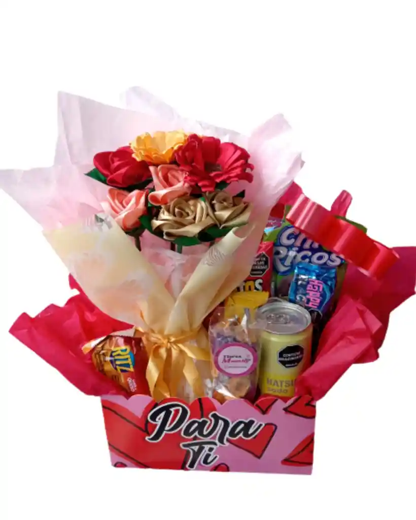 Sorprende a tus seres queridos con nuestra Canasta regalo con flores eternas y snacks, una combinación perfecta de belleza y sabor. Este detalle incluye flores eternas seleccionadas cuidadosamente junto a una variedad deliciosa de snacks para disfrutar en cualquier momento. Ideal para cumpleaños, aniversarios o para expresar cariño de forma especial. Haz que cada regalo sea memorable con un toque de belleza , eternidad y alegria