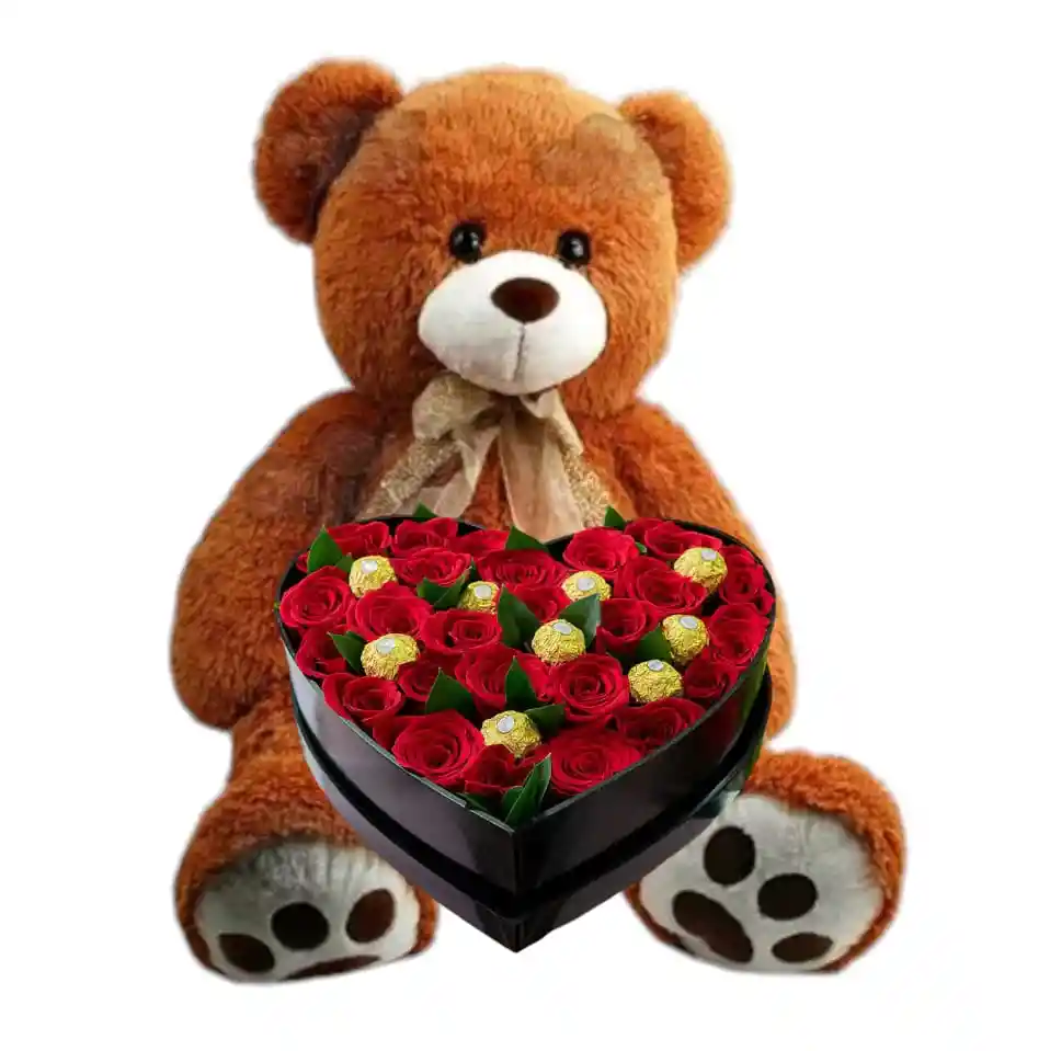 25 ROSAS Y 9 CHOCOLATES FERRERO EN CORAZON MAS OSO MEDIANO CAFE O BLANCO SEGUN INVETARIO