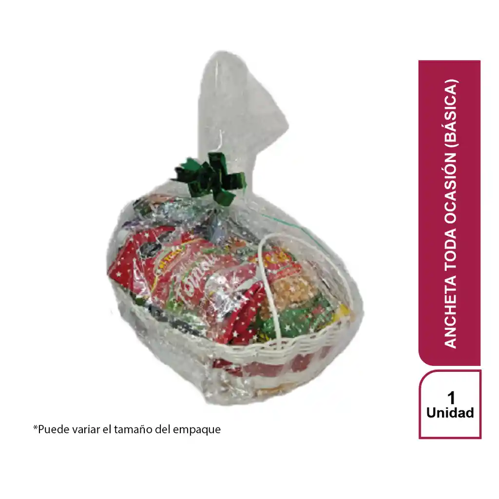 Fríjol 460 Gr Maíz Crispeta 500 Gr Arún Lomitos en Agua Spaghetti X 250 Gr Harina de Maíz Blanca X 500 Gr Bebida Instantéa X 200 Gr Galletas X 130 Gr Bebida Aromática X 20 Sobres Jugo Hit Fruta Deshidratada X 60 Gr Agua Sin Gas 300 Ml (Cristal) Maní 25 Gr Barra de Cereal 23 Gr (Tosh) Salchicha Viena 150 Gr Salsa Mayo 200 Gr Arroz 500 Gr Cerveza Águila Base Ancheta Canasta Artesanal o Recipiente Plástico Empaque Moño Decorativo