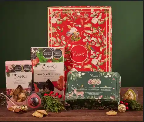 Incluye Barra chocolate blanco con almendras y frutos rojos, infusiones Cap Duo x6, galletas con avena y arándanos y caja regalo decorativa de navidad