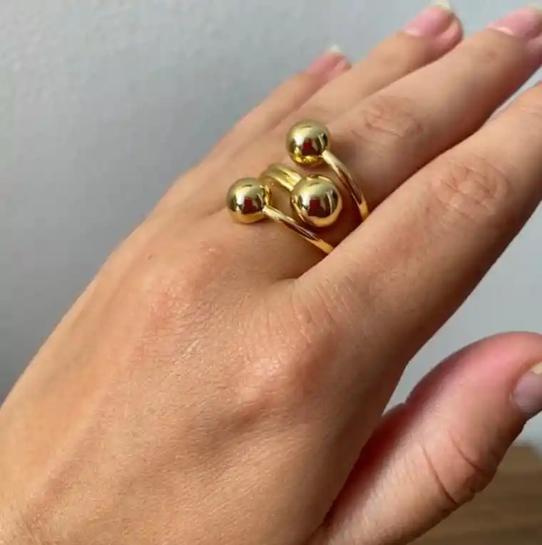 Anillo con dos tres bolas intercaladas formando zigzag, Color dorado , Tamaño ajustable