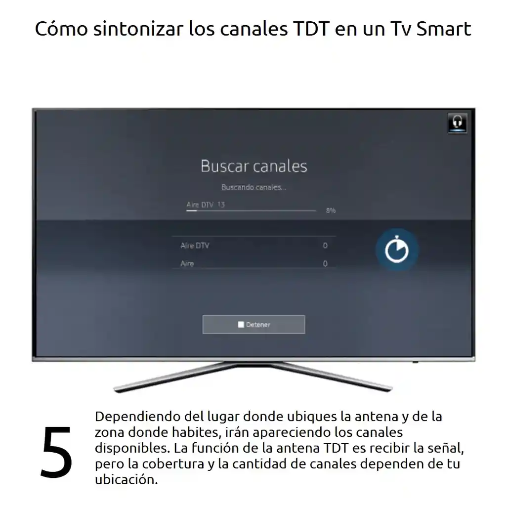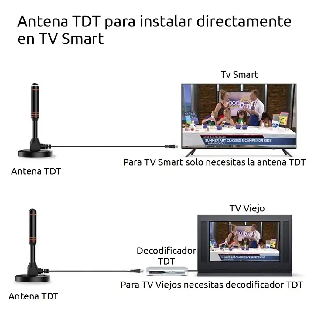 -Tipo: DVB-T2 antena. - Tipo: DVB-T2 antena. Longitud del Cable: aprox. 3 metros. Conecta el extremo (f-macho) del cable coaxial conectado al conector ANT/IN en la parte posterior del sintonizador de TV o TDT. En el menú de configuración del televisor, ajuste el modo sintonizador a "Antena" o "aire". Para obtener instrucciones más detalladas, consulte su manual de TV.