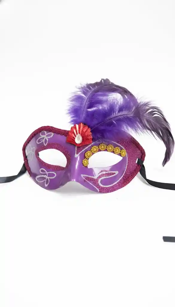 Halloween Producto: Antifaz de Gala con Plumas Color Principal: Morado Detalles: Plumas, lentejuelas, flor con gema central. Materiales: Plástico, plumas sintéticas, tela y adornos. Sujeción: Banda elástica. Talla: Talla única, diseñada para adaptarse a la mayoría de los rostros de adultos.