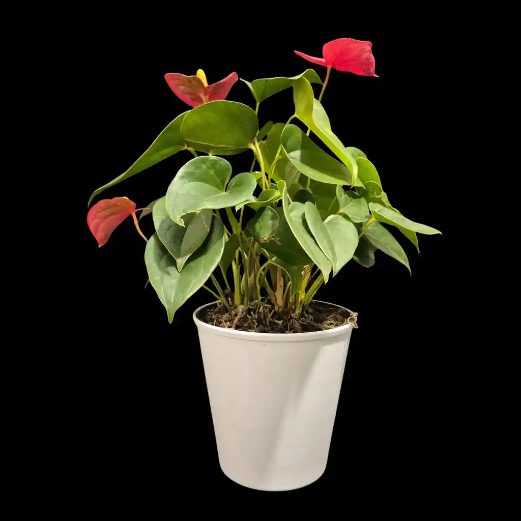 Hermoso anturio rojo acompañado de un elegante portamatera en aluminio blanco, perfecto para dar un toque de frescura y sofisticación a cualquier rincón de tu hogar; su cuidado es muy sencillo, basta con retirar la matera de siembra y regar con abundante agua cuando la tierra esté seca, ya que esta planta disfruta de ambientes interiores con poca luz y se mantiene siempre cómoda y vibrante en espacios cerrados