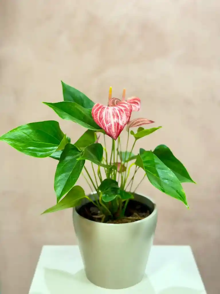 Hermoso y exclusivo anturio livium en colores rojos con pintas blancas, tamaño grande con matera taupe en ceramica.