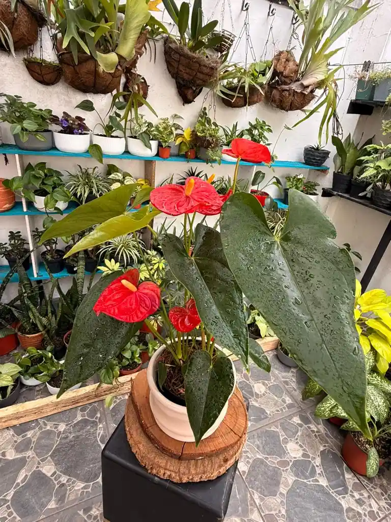 Una planta tropical muy popular como planta de interior. Se caracteriza por sus flores brillantes de color rojo intenso y su follaje verde oscuro y brillante