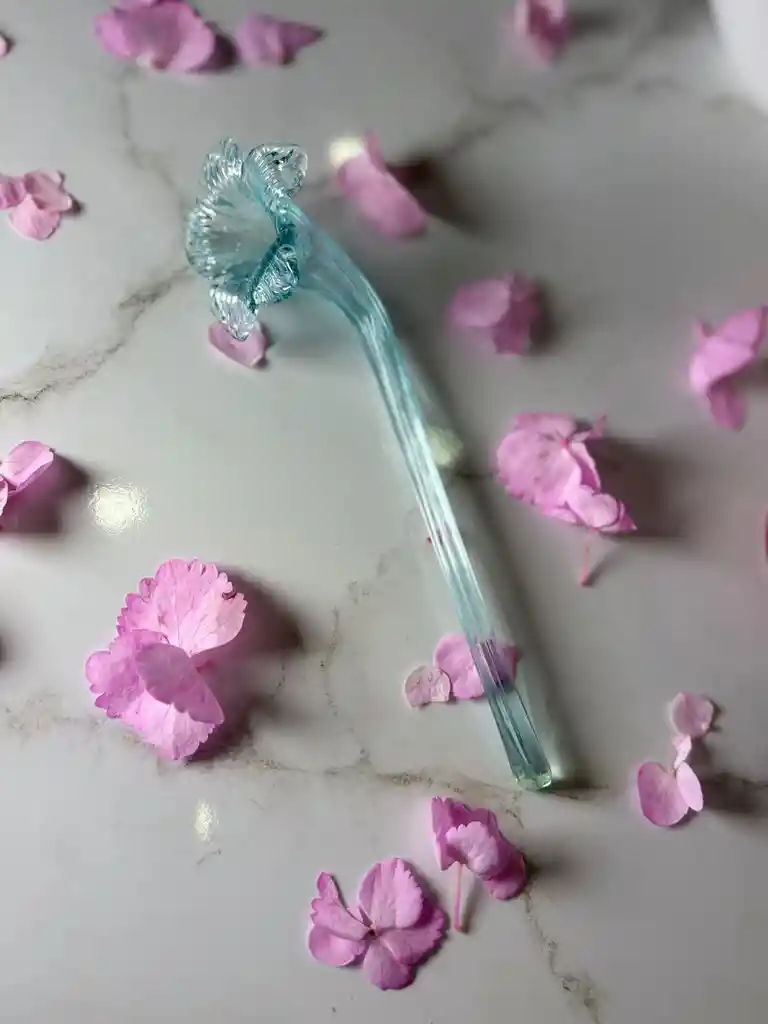 Apagador de velas en forma de flor, hecho a mano con vidrio reciclado por artesanos colombianos.