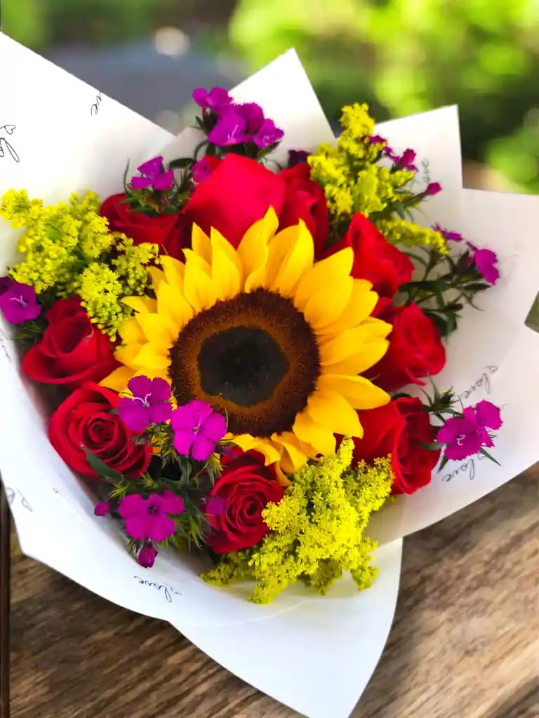 1 GIRASOL Y 9 ROSAS SEGUN DISPONIBILIDAD DE COLOR CON FOLLAJE VERDE, AMARILLO Y PENSAMIENTOS ENVUELTO EN PAPEL COREANO ( COLOR DE PAPEL SEGUN DISPONIBILIDAD) Y MOÑO