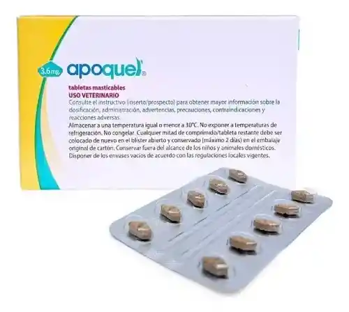 APOQUEL es un medicamento ideal para tratar la dermatitis alérgica en perros. Este producto es para uso interno y debe usarse de acuerdo con las indicaciones médicas del medico veterinario. Este medicamento se puede tomar con el estómago vacío o con alimentos para que se consuma rápidamente. Reduce la piquiña y la inflamación en perros, indicado en perros de 3 a 9 kg.