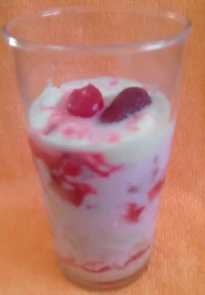 Delicioso postre frío con trocitos de fresa y banano, gelatina de fresa, bañados en Yogur de fresa. Con un toque de leche condensada y crema de leche. Decorado con una cereza.