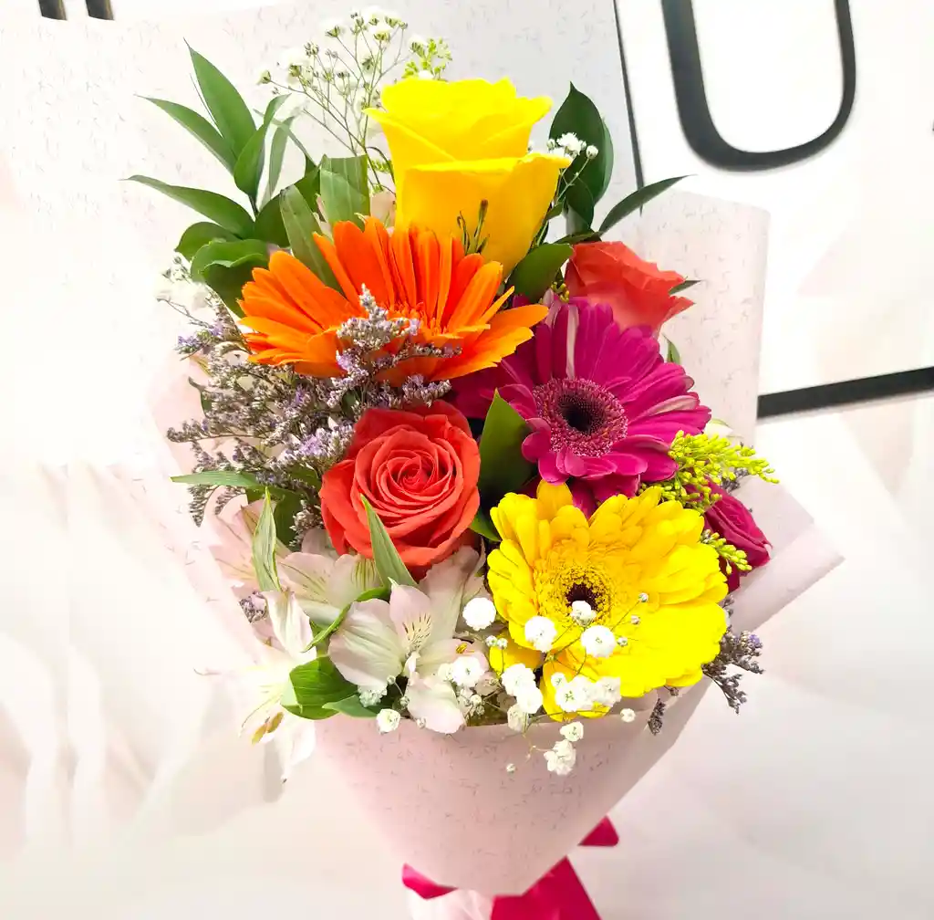 Hermosa combinación de Gerberas y Rosas. El color de las flores puede variar según disponibilidad en tienda.