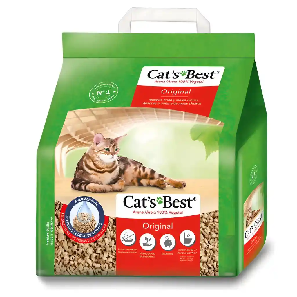 Arena vegetal aglomerante para gatos, Cat’s Best® Original aprovecha el poder de las fibras de madera activa tecnológicamente refinadas. Estas fibras se crean mediante el procedimiento de tecnología de fibra de madera ICS. Los líquidos y los olores se absorben y retienen eficazmente dentro de los gránulos. Por lo tanto, Cat’s Best® Original se puede dejar en el arenero hasta por 5 semanas antes de necesitar ser reemplazado por completo.