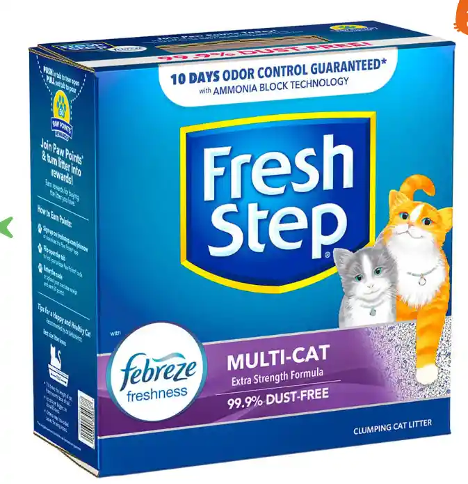 La Arena Para Gatos Fresh Step Multi Cat con Febreze es la solución ideal para hogares con múltiples felinos. Su fórmula avanzada controla los olores de manera efectiva, gracias a la tecnología Febreze, que neutraliza los malos olores y deja un ambiente fresco y agradable. Esta arena está diseñada para absorber la humedad rápidamente, manteniendo la superficie seca y cómoda para tus gatos. Además, su textura suave y gránulos de alta calidad son perfectos para las patas de tus mascotas, evitando irritaciones y asegurando su bienestar. La arena se aglomera con facilidad, lo que facilita la limpieza diaria y prolonga la duración del producto. Con Fresh Step, puedes disfrutar de un hogar limpio y libre de olores, mientras tus gatos se sienten cómodos y felices. Ideal para dueños de varios gatos, esta arena ofrece un rendimiento superior y una experiencia de uso inigualable. La combinación de su capacidad de absorción y control de olores la convierte en una opción preferida entre los amantes de los felinos. Dale a tus gatos el cuidado que merecen y transforma su espacio en un lugar más agradable con Arena Para Gatos Fresh Step.