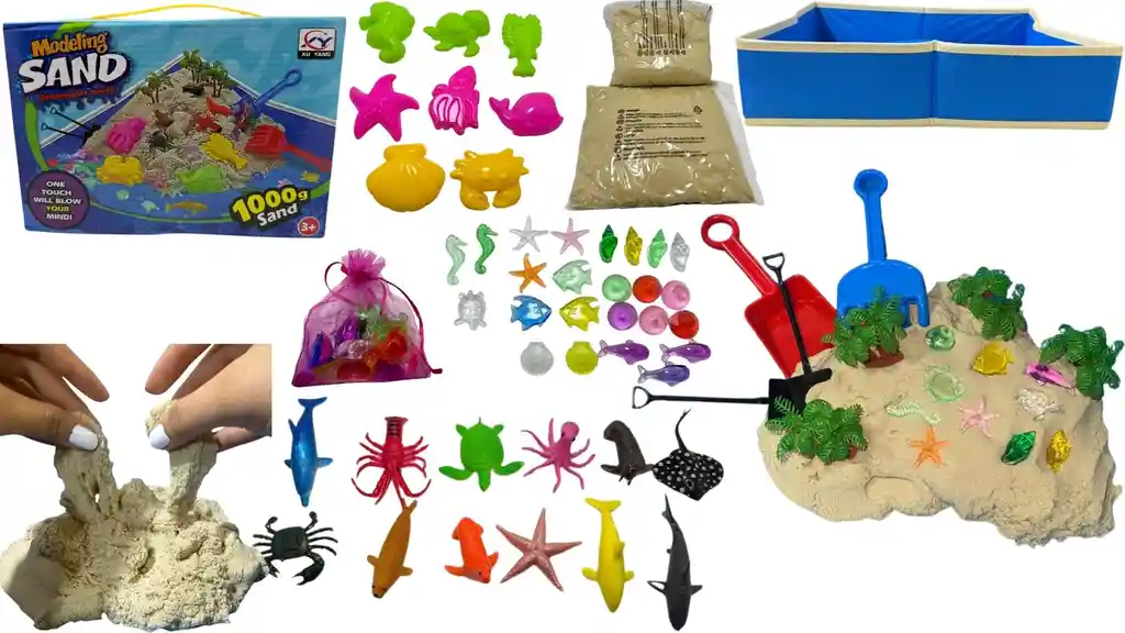 Juguete Arenero con Arena Artificial Moldeable y Moldes de Animales Marinos REF: 1913 Con el Juguete Arenero de Arena Mágica, los niños podrán crear, explorar y dejar volar su imaginación sin necesidad de ir a la playa. Este completo set incluye arena artificial moldeable, moldes, herramientas y figuras marinas para que los pequeños vivan una experiencia sensorial y creativa mientras desarrollan su motricidad y coordinación. Ideal para jugar en casa, estimula la creatividad y el aprendizaje a través del juego táctil. CARACTERÍSTICAS: Profundidad del arenero: 7 cm Largo del arenero: 39 cm Contiene 1 Kg de arena artificial moldeable Incluye 2 mini palas, 1 pala grande y 1 rastrillo Moldes de plástico con formas de animales marinos y conchas Figuras en resina: conchas, estrellas de mar, delfines, peces, caballitos de mar y tortugas Animales de hule incluidos Materiales resistentes y seguros para niños Condición del producto: Nuevo ¿QUÉ INCLUYE TU PRODUCTO? 1 Arenero plástico 1 Kg de arena mágica moldeable 2 mini palas, 1 pala grande y 1 rastrillo Moldes de plástico Figuras en resina y animales de hule BENEFICIOS: Estimula la creatividad y la imaginación Desarrolla la motricidad fina Fomenta el juego libre y sensorial Ideal para actividades educativas o recreativas Perfecto como regalo infantil Un juego completo, divertido y educativo que transforma cualquier espacio en una mini playa llena de color y diversión. ZZZZZZZZZZZZZZZZZZZZZZZZZZZZZZZZZZZZZZZZZZZZZZZZZZZZZZZZZZZZZZZZZZZZZZ MÁS DETALLES: Condición: Nuevo MÁS INFORMACIÓN DE NOSOTROS Somos INVERSIONES MAZUGI. Importadores directos desde China. Cumplimos con distribuir a todo el país. Estamos ubicados en Bogotá, somos tienda virtual y física. PRODUCTOS AL POR MAYOR Y DETALLE. Somos una empresa importadora y comercializadora de productos de alta calidad de varias categorías como: belleza, tecnología, hogar, juguetería, cuidado personal, entre otras.