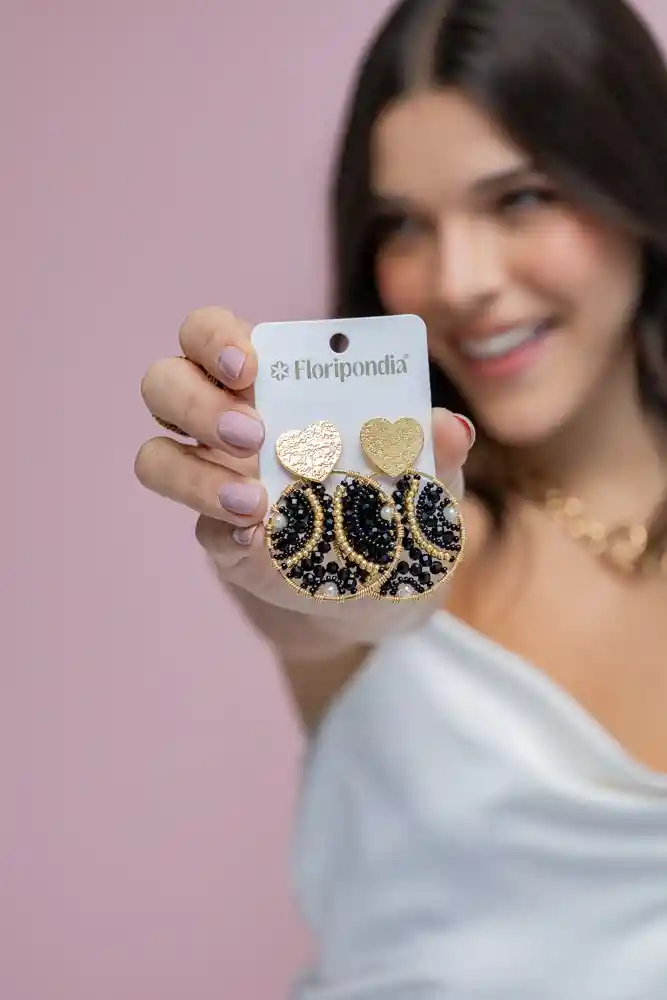 Aretes elaborados en mostacilla checa, balines y muranos. Base en Bronce con baño en oro de 24k. Incluye: 1 par de aretes negro corazon. Recibe con tu compra una FLORIBAG gratis, para que guardes por separado tus accesorios. Hecho a mano en Colombia. * Ten presente que algunas de las imágenes pueden estar ambientadas con otros productos que se venden por separado.