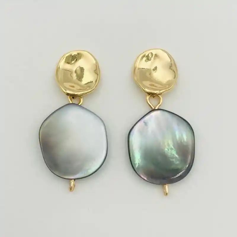 Aretes Caroco dorados, con un disco irregular ondulado y un nácar natural en forma hexagonal irregular. Los aretes miden 3cm de largo total.
