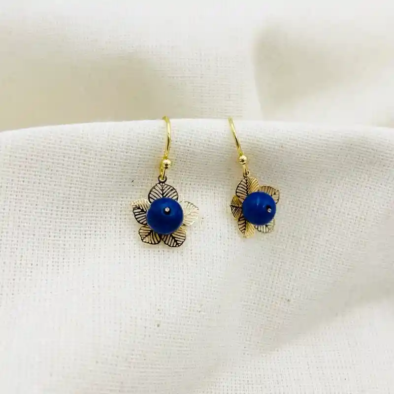 Aretes dorados con piedra Lapislázuli natural. Material: bronce bañado en oro de 18k. Largo total 2,4cm. Se entrega empacado para regalo. Recomendaciones de cuidado: Mantén tus joyas separadas unas de otras para evitar que se enreden y se rayen. Evita el uso de forma de directa de químicos como perfumes, cremas y productos de limpieza. Guarda tus accesorios limpios en un lugar seco y lejos del sol y la humedad.
