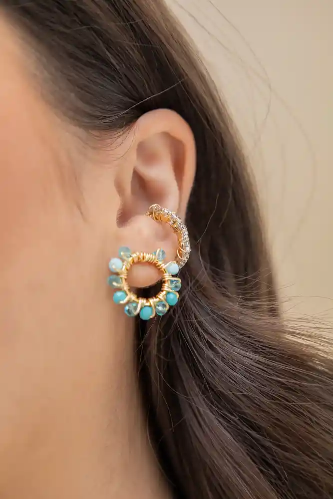 Topos elaborados en Bronce con baño de oro de 24k con muranos. Base en Bronce con baño en oro de 24k. Incluye: 1 par de aretes circular azul. Recibe con tu compra una FLORIBAG gratis, para que guardes por separado tus accesorios. Hecho a mano en Colombia. * Ten presente que algunas de las imágenes pueden estar ambientadas con otros productos que se venden por separado.