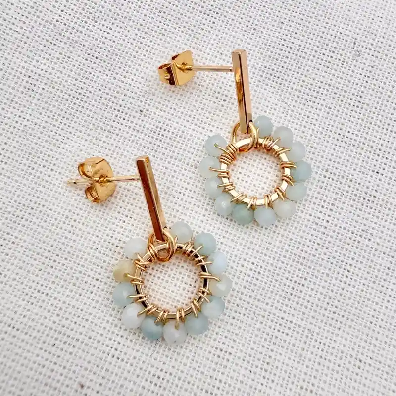 Aretes de la marca Caroco, ¨Margarita verde agua¨ con piedras Amazonita naturales entorchadas a mano. Largo total 2,5cm. Se entregan empacados para regalo. Material: bronce bañado en oro de 18k. Producto con garantía por fallas de fabricación. Recomendaciones de cuidado: Mantén tus joyas separadas unas de otras para evitar que se enreden y se rayen. Evita el uso de forma de directa de químicos como perfumes, cremas y productos de limpieza. Guarda tus accesorios limpios en un lugar seco y lejos del sol y la humedad.