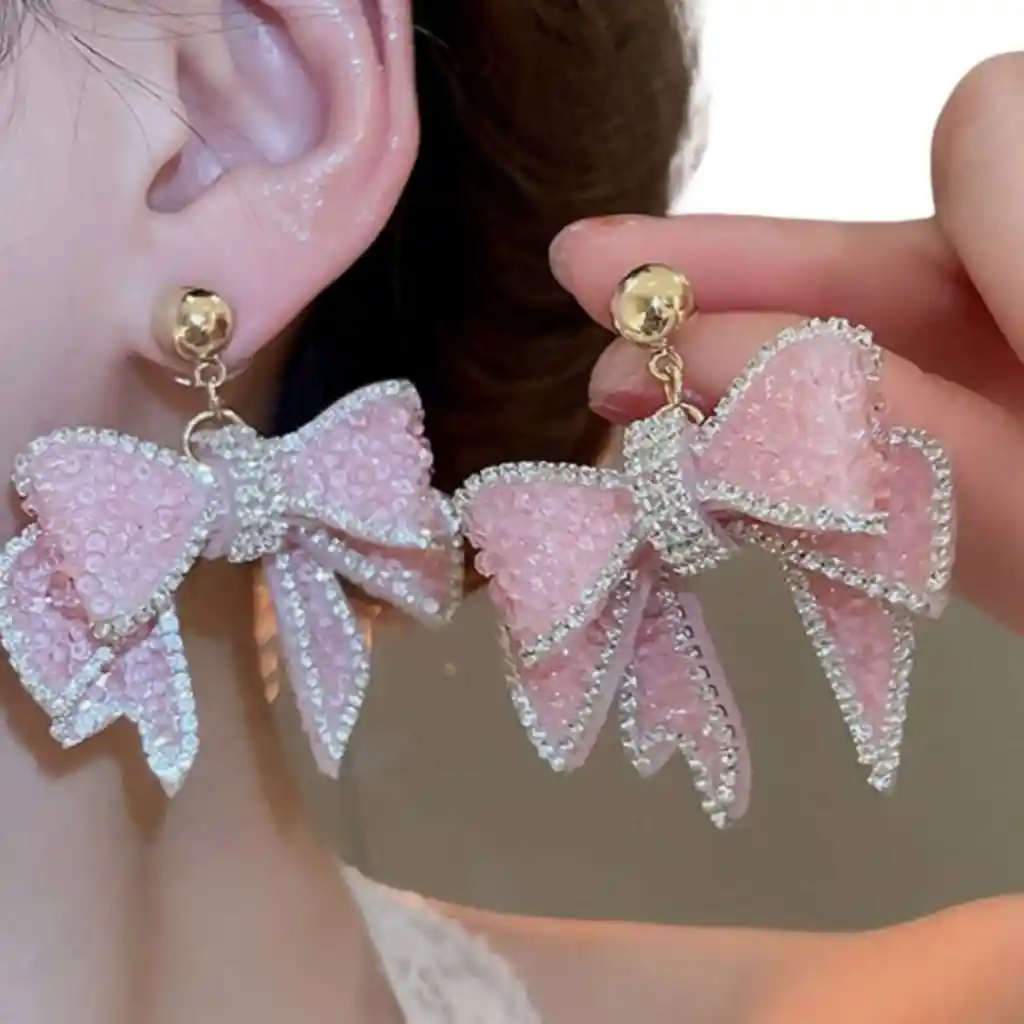 Estos aretes en forma de moño rosado son el accesorio ideal para darle a tus outfits un toque femenino, tierno y glamuroso. Su diseño brillante y detallado los hace perfectos para destacar en cualquier ocasión. ✨ Características del producto: Forma de moño grande en tono rosado pastel. Bordeado con pequeñas piedritas brillantes que aportan luminosidad. Base dorada con cierre cómodo y seguro. Diseño coquette, elegante y moderno. Ligeros y fáciles de combinar con cualquier look. Ideal para: ✔ Looks coquette o románticos ✔ Eventos, cenas y salidas ✔ Sesiones de fotos ✔ Regalos especiales