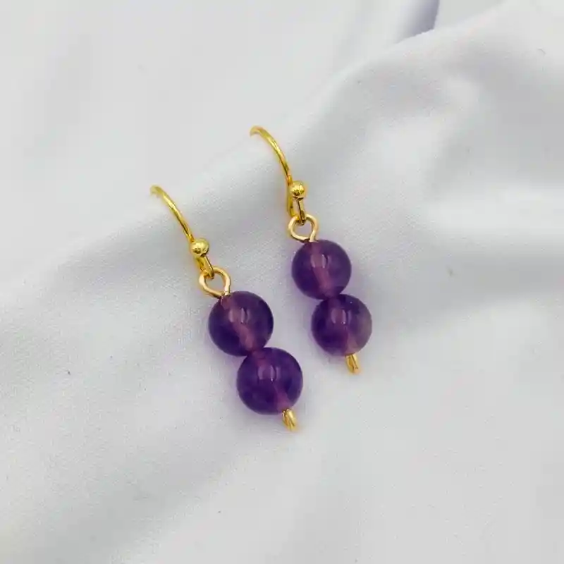 Aretes con un ganchito dorado y 2 piedras Amatistas naturales de 6mm. Los aretes tiene un largo total de 2,6cm. Ganchos de bronce con baño de oro de 18k. libre de níquel. Los aretes se entregan empacados para regalo. Todos nuestros productos tienen garantía por fallas de fabricación. Recomendaciones de cuidado: Mantén tus joyas separadas unas de otras para evitar que se enreden y se rayen. Evita el uso de forma de directa de químicos como perfumes, cremas y productos de limpieza. Guarda tus accesorios limpios en un lugar seco y lejos del sol.