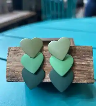 Aretes de topo con tres corazones en capas en distintos tonos de verde. 4.5 cm x 2 cm