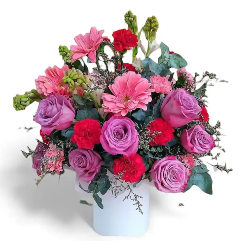 Arreglo floral de gerberas con lirios, rosas , boca de dragón , clavel , eucalipto y caspia , envuelto en papel coreano