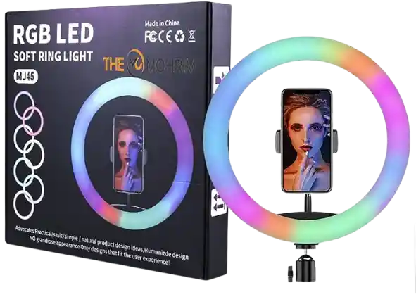 Ideal para grabaciones, transmisiones en vivo, maquillaje, fotografía y videollamadas. Incluye un aro de luz LED con modo RGB multicolor, controles de intensidad y diferentes tonos de blanco cálido, neutro y frío. cuenta con soportes para celular, además de control remoto para cambiar los modos de iluminación.
