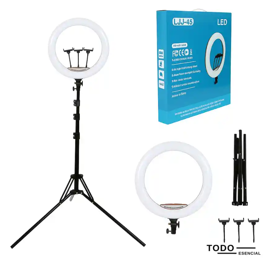 Aro de Luz LED Profesional LJJ-45 – 45 cm con Trípode 💡📸 Ilumina como un profesional con el Aro de Luz LED LJJ-45, diseñado para fotografía, maquillaje, grabaciones y transmisiones en vivo. Su diámetro de 45 cm ofrece una iluminación uniforme y regulable, ideal para obtener tonos de piel naturales y eliminar sombras no deseadas. Incluye un trípode ajustable y soporte universal para 3 teléfonos, lo que te permite adaptarlo fácilmente a cualquier espacio o ángulo de trabajo. Perfecto para creadores de contenido, maquilladores, videollamadas o estudios fotográficos. ✨ Características principales: 💡 Diámetro de 45 cm: cobertura de luz amplia y uniforme. 🌈 Temperatura ajustable: tonos cálidos, neutros y fríos según la necesidad. 🔄 Brillo regulable: control preciso de intensidad para cada ambiente. 📱 Soporta 3 teléfonos a la vez. 📸 Trípode resistente y ajustable: altura y ángulo totalmente configurables.