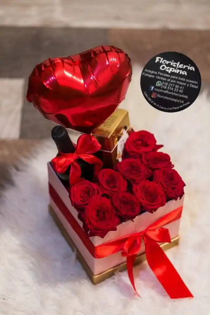 Arreglo elaborado con rosas rojas, bebida Baileys, cajas de chocolates Ferrero Rocher x8 y caja decorativa.