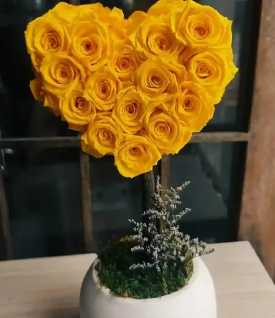 TOPIARIO DE ROSAS PRESERVADAS EN FORMA DE CORAZON, UN DETALLE ELEGANTE Y DURADERO QUE CONSERVA SU BELLEZA POR AÑOS SIN AGUA