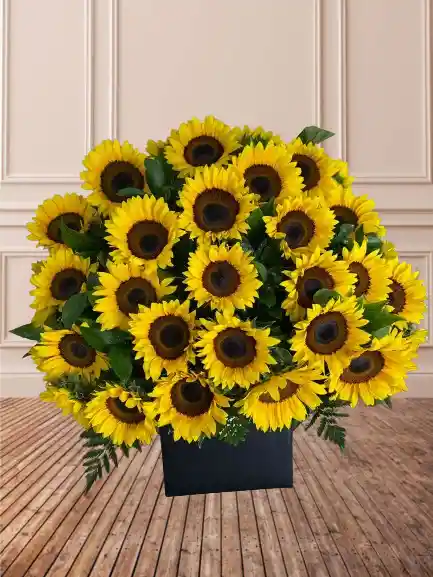 arreglo de 48 girasoles en caja cuadrada