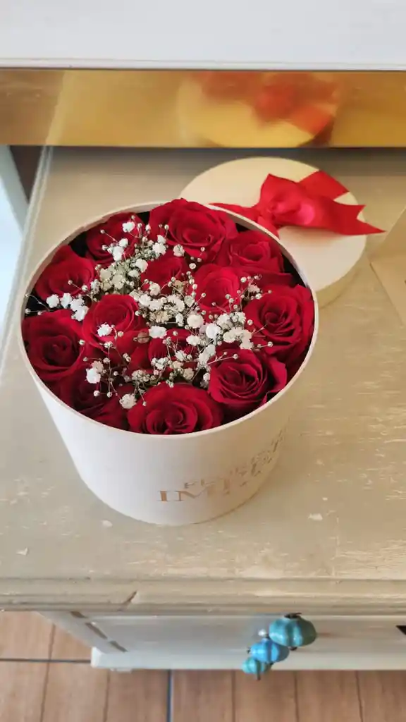 1 caja mediana, 15 rosas rojas, 1 gipsofilia