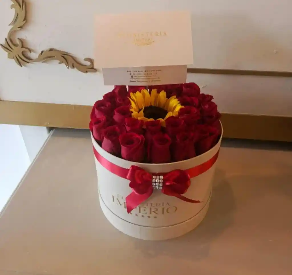 26 rosas rojas, 1 girasol, mensaje personalizado