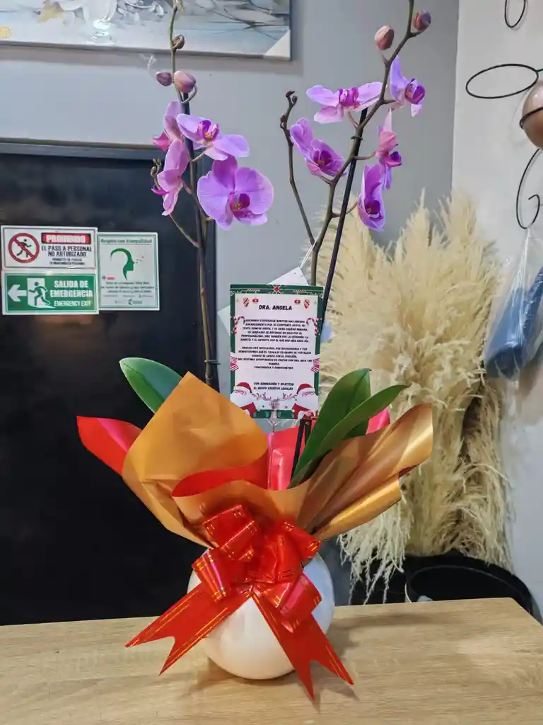 Arreglo de Orquidea de 2 varas con decoración y tarjeta personalizada (ten en cuenta que este producto esta sujeto a cambios según su temporada y disponibilidad)