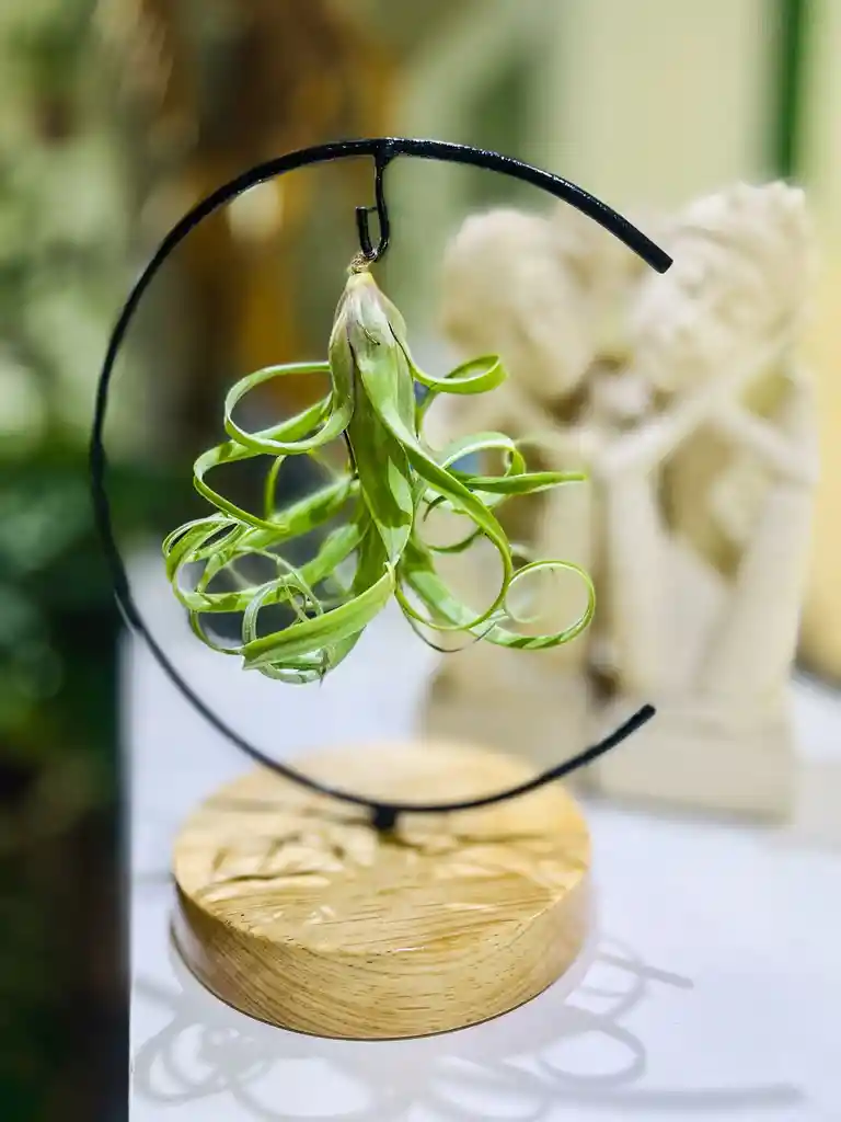 Arreglo de Tillandsia Rizada en Base de Madera con Aro Metálico | Regalo Natural y Contemporáneo a Domicilio Hermoso arreglo con Tillandsia natural de hojas rizadas, una planta aérea única que destaca por su forma orgánica y movimiento natural. Su diseño liviano y elegante simboliza libertad, equilibrio y conexión con la naturaleza, ideal para espacios modernos y minimalistas. Viene presentada en una base circular de madera natural con aro metálico negro, cuidadosamente armada y lista para regalar. Es una opción perfecta para quienes buscan un detalle original, decorativo y de fácil cuidado, ideal para envío a domicilio. 🌸 Características del arreglo Tillandsia natural (planta aérea) Hojas verdes rizadas y decorativas Base de madera natural incluida Aro metálico negro de diseño moderno No requiere tierra Presentación minimalista Ideal para interiores 🎁 Perfecto para: Detalles especiales Regalos corporativos Decoración moderna Regalos originales y diferentes Envíos de plantas y regalos vivos a domicilio 🌿 Cuidados del arreglo Luz: Luz indirecta brillante Riego: Pulverizar agua 2–3 veces por semana Ambiente: Interior con buena ventilación Duración: Planta de larga duración y fácil mantenimiento Compra este arreglo de tillandsia rizada en base de diseño y recíbelo a domicilio con una presentación moderna y natural, ideal para sorprender con un regalo vivo y diferente.