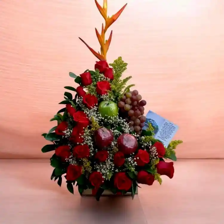 Contiene 24. Rosas Rojas. Ave del Paraíso frutas Uvas 2 Manzana roja 1 manzana verde follaje Tarjeta personalizada
