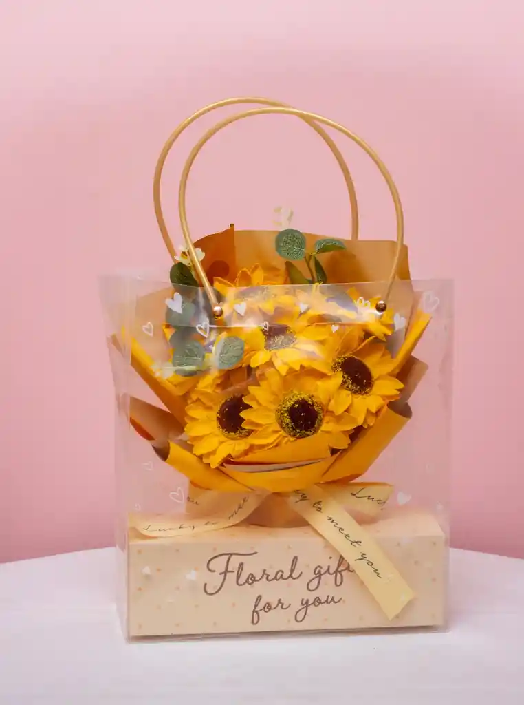 Este alegre y soleado arreglo floral artificial está compuesto por un bouquet de radiantes girasoles amarillos de gran tamaño y centros oscuros, que están acompañados por follaje verde artificial, posiblemente hojas de eucalipto, y envuelto en papel o cartulina de tonos amarillos y marrones que imitan la calidez de la tierra. La presentación es distintiva, ya que el bouquet se encuentra dentro de una bolsa transparente de PVC con asas doradas, decorada con sutiles corazones y un fondo que simula una caja de regalo moderno y desenfadado, ideal para regalar luz y felicidad.