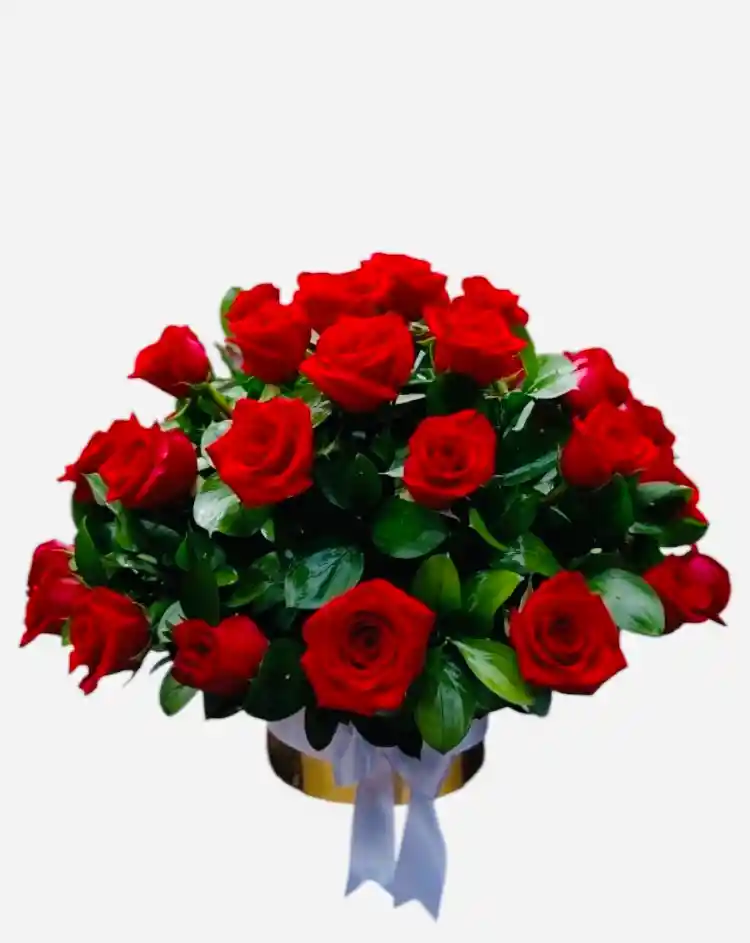 Impresionante arreglo floral con 48 rosas rojas de tallo corto, y follaje verde, cuidadosamente dispuestas en una elegante caja redonda con moño decorativo. Ideal para expresar amor, admiración o celebrar momentos especiales con estilo y elegancia.