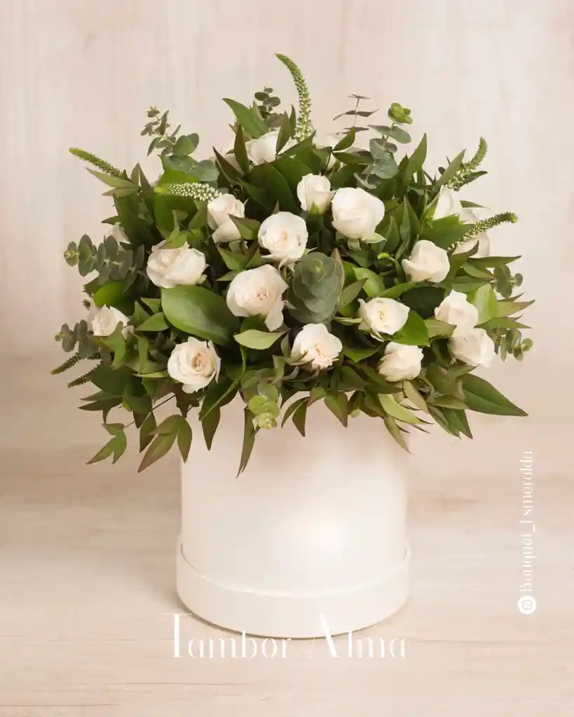 Contiene entre 20 y 24 rosas blancas, acompañadas de follajes verdes como eucalipto y otras variedades. La composición floral está sujeta a disponibilidad. Diseño exclusivo del florista, elaborado en armonía con la paleta de colores seleccionada.