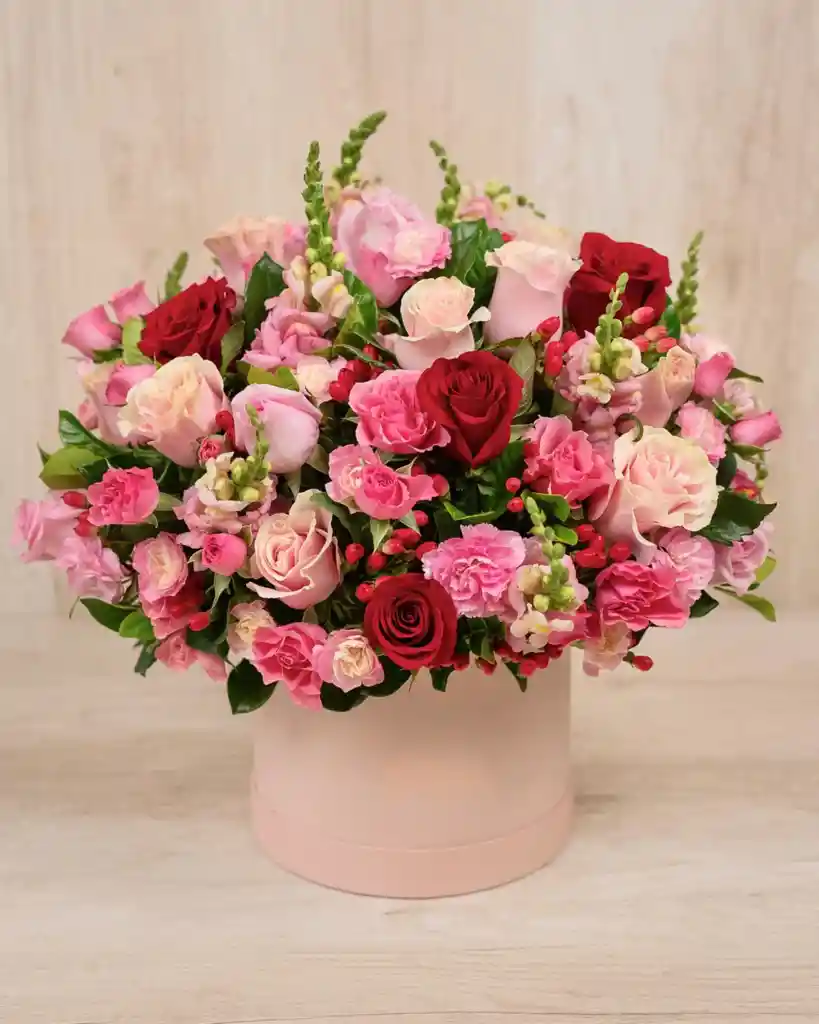 Un diseño romántico y moderno que transmite fuerza y dulzura. Este delicado arreglo combina rosas premium en tonos rojos y rosados, símbolos de amor y gratitud, acompañadas por un mix que puede contener mini rosas, clavel importado, hipérico, hoja de gardenia y otras flores de temporada, siempre sujeto a disponibilidad. Todo dispuesto en una elegante caja redonda rosa que realza la armonía del diseño. Un detalle perfecto para celebrar el amor, agradecer con estilo o sorprender en un momento especial.