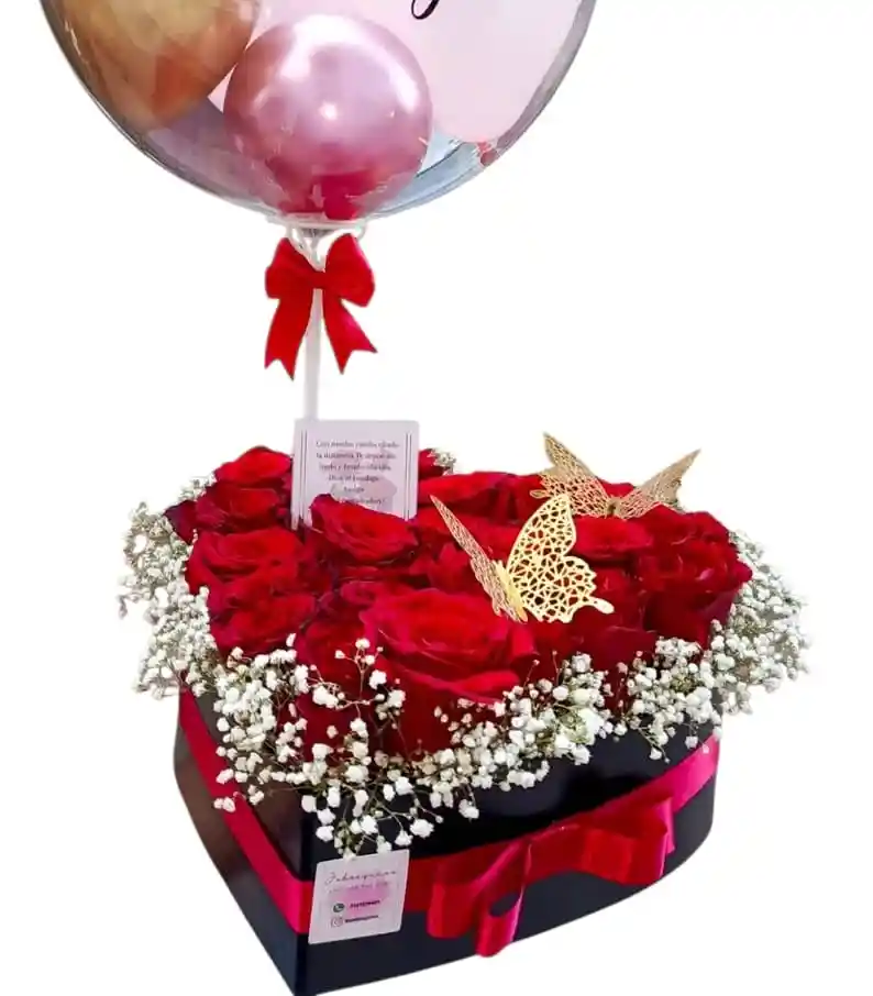 Contiene  Corazón Rosas rojas Follaje blanco Mariposas, decorativas Globo Decoración