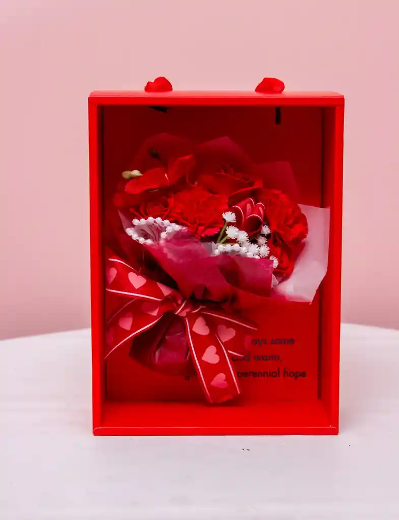 Claro que sí. Este es un elegante arreglo floral artificial predominantemente en tonos de rojo vibrante, presentado cuidadosamente dentro de una caja de regalo cuadrada de color rojo intenso; el bouquet en sí, compuesto por una mezcla de flores grandes tipo rosas y claveles artificiales, junto a pequeños acentos de flores blancas como el velo de novia y adornos de perlas, está envuelto en papel blanco y atado con un llamativo lazo de cinta rojo adornado con corazones blancos, lo que le confiere un aire muy romántico y festivo, y la base de la caja incluye una frase impresa que le añade un mensaje cálido y esperanzador.