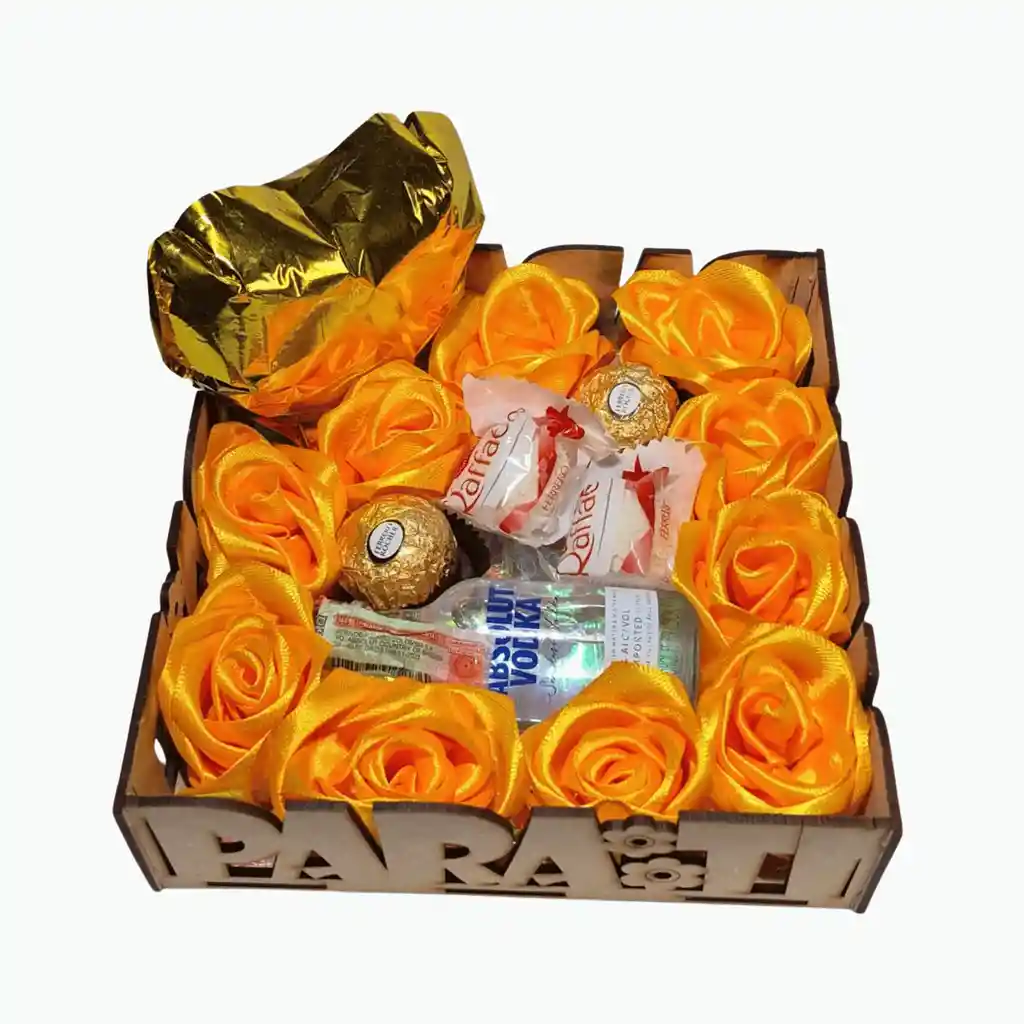 ofisticado detalle artesanal en base cuadrada de madera con calado decorativo. Contiene 10 rosas eternas amarillas hechas a mano, una botella miniatura de Absolut Vodka, un globo metalizado dorado a juego, 2 bombones Ferrero Rocher y 2 especialidades Raffaello. Se entrega en una caja personalizada diseñada a medida para asegurar la estabilidad de la botella y la elegancia del conjunto.