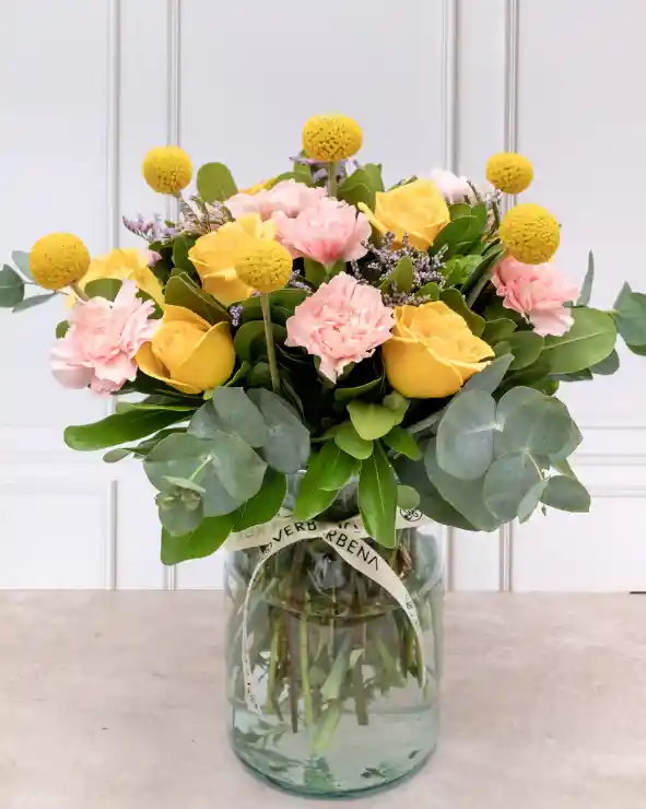 Este ramo Lolita está conformado por rosas amarillas, claveles rosas y craspedia, que representan amor, felicidad y prosperidad. Un regalo perfecto para expresar tus sentimientos a un ser querido. Con su delicada combinación de colores y flores, seguramente alegrará su día.