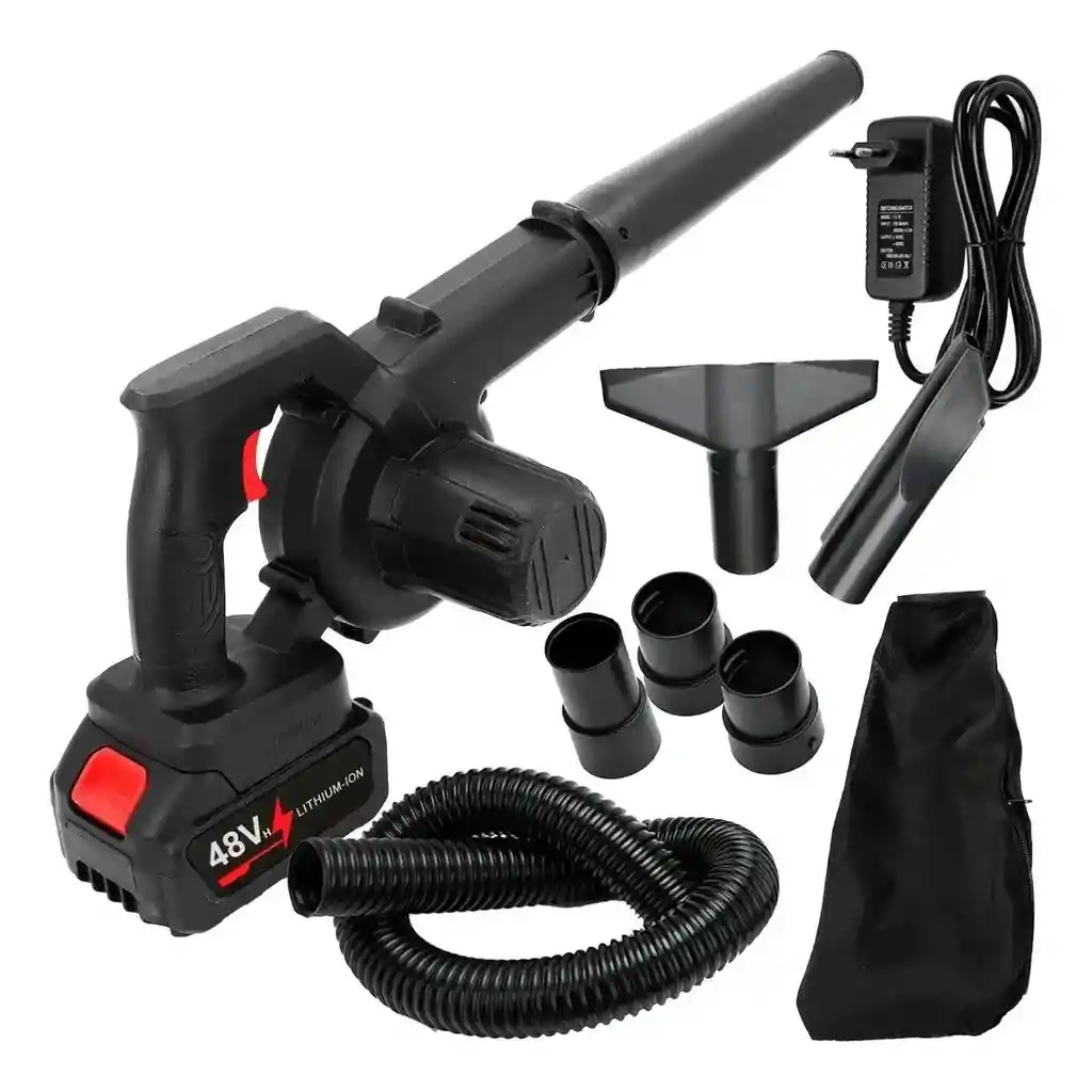 Sopladora/Aspiradora Eléctrica Portátil 48V con Batería Recargable Mantén tus espacios siempre limpios y libres de polvo con esta sopladora inalámbrica de 48V, diseñada para brindar potencia, practicidad y comodidad en cualquier lugar. - Características principales: • Batería de litio 48V recargable, de gran capacidad y larga --duración. • Función 2 en 1: sopladora y aspiradora con bolsa recolectora incluida. • Motor potente, ideal para limpieza de talleres, autos, jardines, computadoras y más. • Diseño portátil y ergonómico con mango antideslizante para mayor comodidad. • Ligera y fácil de transportar. - Incluye en el paquete: • 1 Sopladora/Aspiradora eléctrica 48V • 1 Batería de litio recargable • 1 Cargador • 1 Bolsa recolectora de polvo • 1 Manual de usuario • Accesorios de montaje