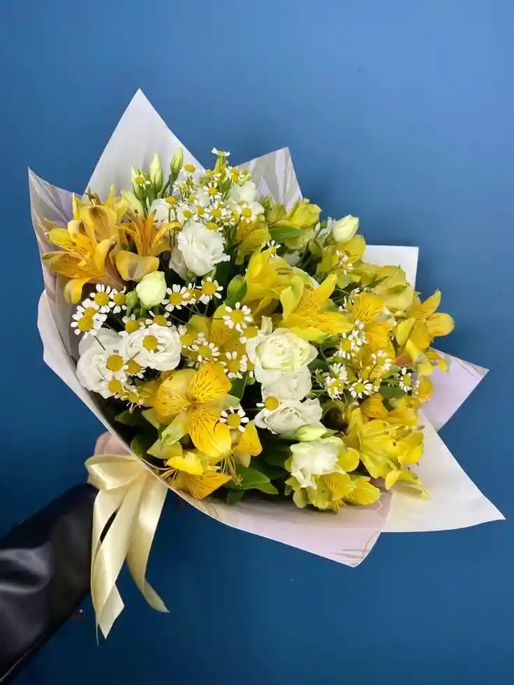 Incluye: pte de astromelias amarillas, rosas blancas x8, decoracion y mensaje personalizado