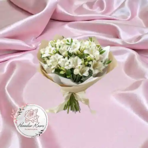 Elegante ramo de alstroemerias blancas,2 paquete, envuelto en papel kraft, Ideal para transmitir paz, gratitud y buenos deseos, condolencias o acompañamiento en momentos difíciles, Celebraciones espirituales o religiosas, Detalles corporativos elegantes. tarjeta personalizada escríbelo en el chat.