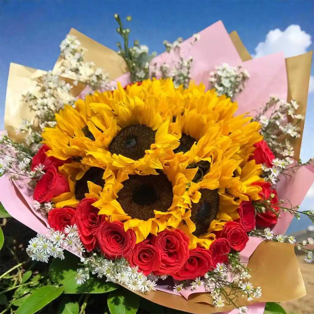 🌇🌻🌹Descubre un bouquet que irradia luz y dulzura en cada pétalo. En Loren's Floristería, hemos fusionado la fuerza del sol con la delicadeza de los tonos pasteles para crear un regalo que abraza el corazón y alegra la vista. Este diseño destaca por su volumen generoso y su acabado romántico: Doble Protagonismo: Una armoniosa combinación de 12 Girasoles radiantes, que simbolizan la felicidad, rodeados por 20 Rosas Rojas premium que aportan el toque clásico de la pasión. Detalle de Luz: Salpicado con Monte Casino blanco, que añade una textura suave y pequeños puntos de luz que realzan el contraste entre el amarillo y el rojo. Toque de Ternura: Sellado con un envoltorio de Papel Coreano Rosado, diseñado para suavizar la composición y darle un aire tierno, moderno y sofisticado. Presentación de Boutique: Los pliegues del papel y la disposición de las flores crean un bouquet de gran impacto visual, ideal para ser el centro de atención en cualquier entrega. Es el detalle perfecto para celebrar un cumpleaños, un logro especial o simplemente para decir "gracias por existir" con un estilo único y acogedor.